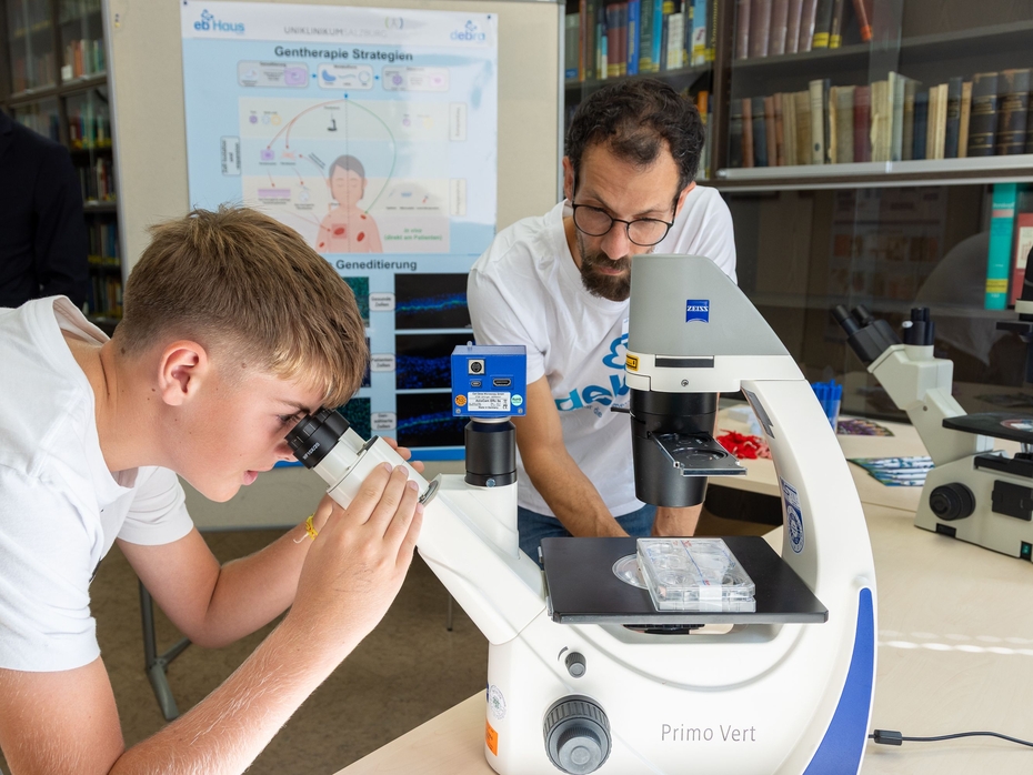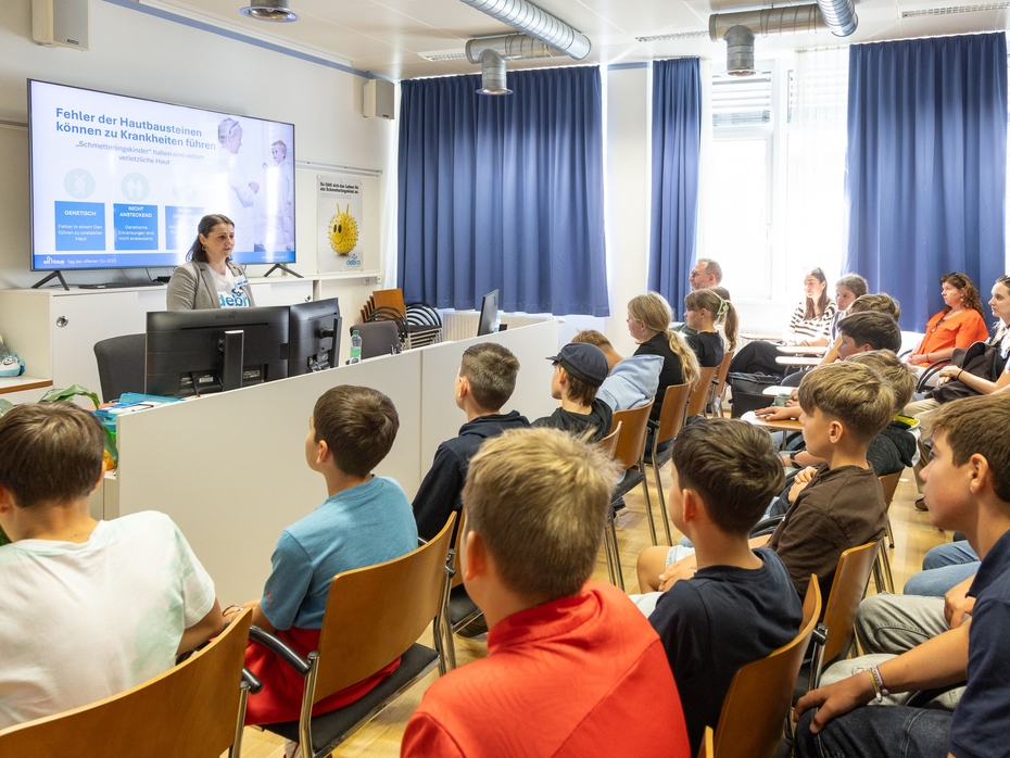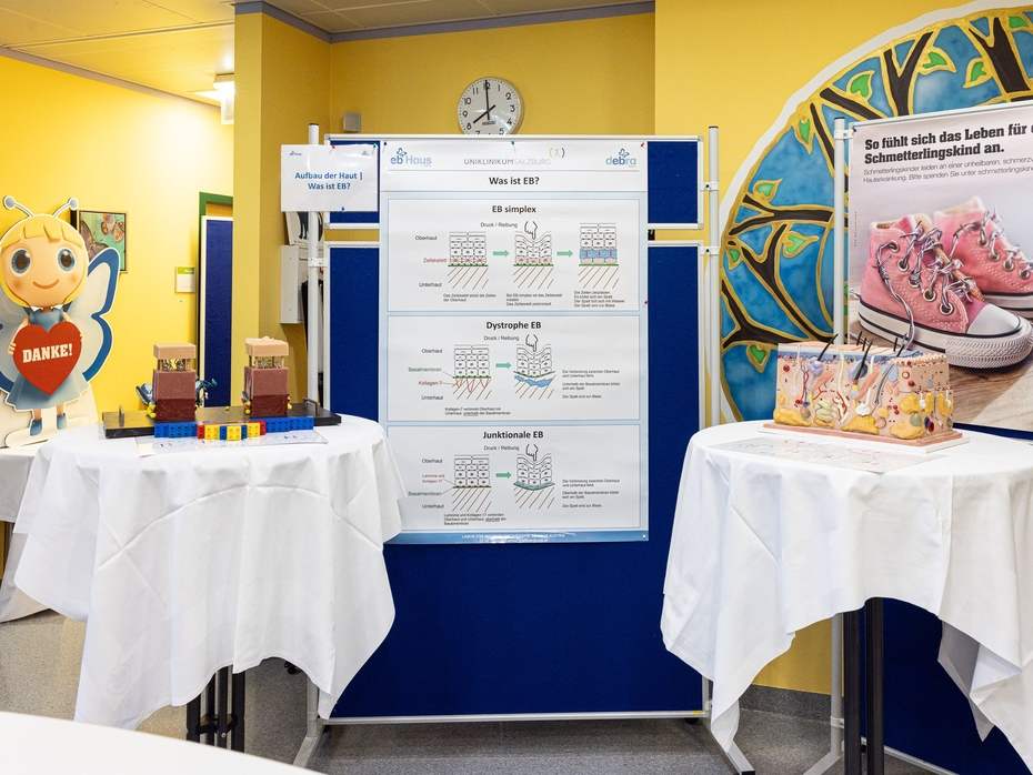 Das EB-Haus Team präsentierte beim Tag der offenen Tür die vielfältigen Arbeitsschwerpunkte rund um die Versorgung von Menschen mit Epidermolysis bullosa (EB). Anhand interaktiver Stationen wurde eindrucksvoll gezeigt, wie in Salzburg geforscht, therapiert und unterstützt wird.