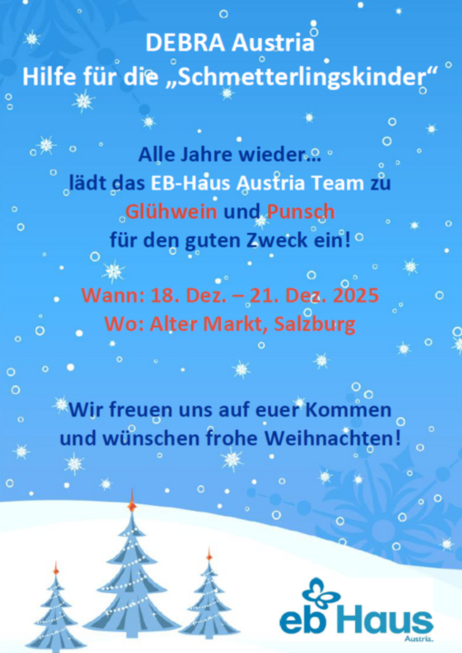 Von 18.12.2025 – 21.12.2025 freuen sich die MitarbeiterInnen des EB-Haus auf alle Gäste, die mehr über das Leben mit der Erkrankung der “Schmetterlingskinder”, Epidermolysis bullosa, erfahren oder einfach im gemütlichen Rahmen einen Punsch genießen möchten! Kommt vorbei, beim Punschstand am Alten Markt!